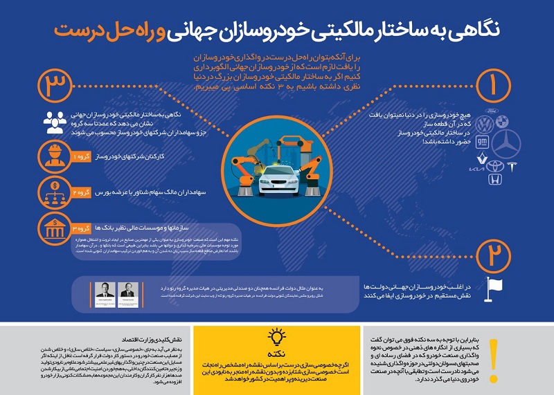 در ادامه اینفوگرافیک زیر با موضوع ” الگوبرداری جهانی؛ راه حل درست برای واگذاری خودروسازان ” را با یکدیگر مرور میکنیم: