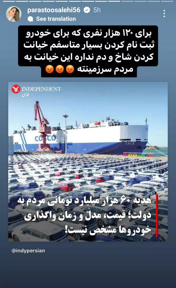 پرستو صالحی، بازیگر سینما و تلویزیون که چندی پیش به خارج از کشور مهاجرت کرده از نحوه مواجهه مردم با طرح بحثبرانگیزِ قرعهکشی خودرو به شدت انتقاد کرده است.