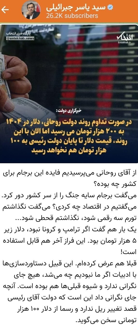 به گزارش پیامد نیوز، جماران نوشت: یاسر جبرائیلی، رئیس مرکز ارزیابی و نظارت راهبردی مجمع تشخیص مصلحت نظام در کانال شخصی خود در پیامرسان ایتا نوشت: «از آقای روحانی میپرسیدیم فایده این برجام برای کشور چه بوده؟ میگفت برجام سایه جنگ را از سر کشور دور کرد. میگفتیم در اقتصاد چه کردی؟ میگفت نگذاشتم تورم سه رقمی شود، نگذاشتم قحطی شود… یک بار هم گفت اگر ترامپ و کرونا نبود، دلار زیر ۵ هزار تومان بود. این فراز آخر هم قابل استفاده است! قبلا هم عرض کردهام. این قبیل دستاوردسازیها با ادبیات اگر ما نبودیم چه میشد، هیچ جای نگرانی ندارد و شیوه قبلیها هم بوده است. آنچه جای نگرانی داد این است که دولت آقای رئیسی قصد تغییر ریل ندارد و رسما از دلار ۱۰۰ هزار تومانی سخن میگوید.»