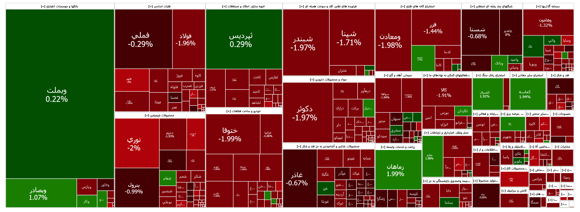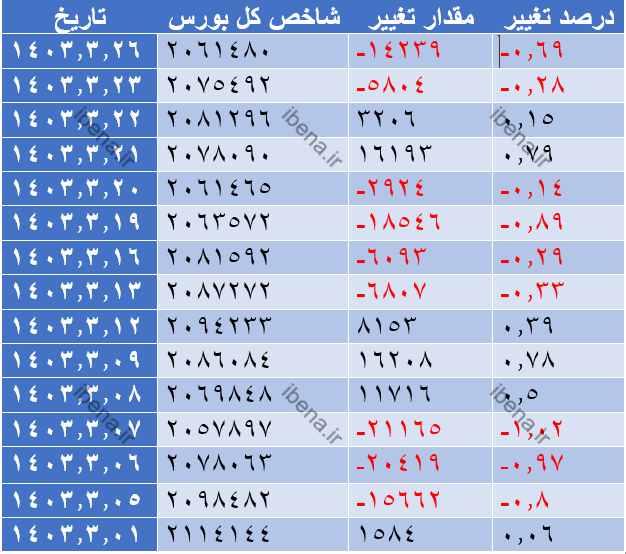 شاخص کل فرابورس نیز ۰.۴۹ درصد کاهش داشته و در کانال ۲۱ هزار و ۹۲۳ واحدی ایستاده است.
