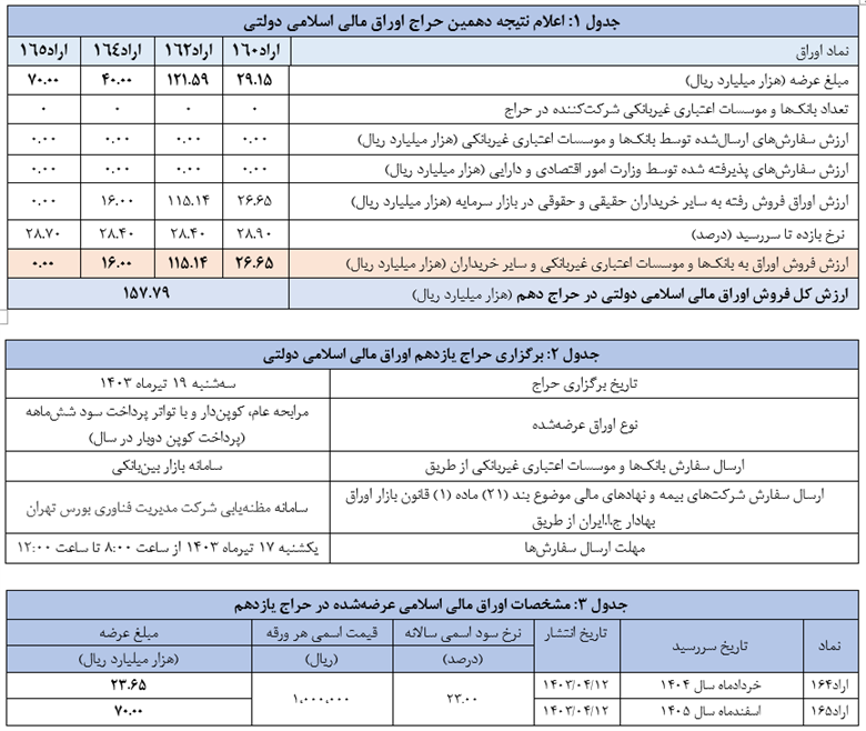 اعلام نتیجه دهمین حراج اوراق مالی اسلامی دولتی و برگزاری حراج یازدهم در سال ۱۴۰۳