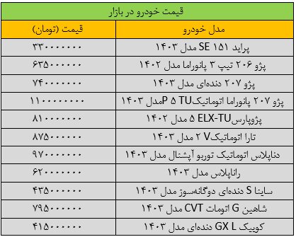 در این میان، قیمت پژو ۲۰۶ تیپ ۳ پانوراما مدل ۱۴۰۲ هم 5 میلیون تومان گران شد و ۶۳5 میلیون تومان قیمت خورده است. پژو ۲۰۷ دندهای مدل ۱۴۰۳ هم ۵ میلیون تومان گران شد و ۷40 میلیون تومان به فروش رفت. همچنین پژو ۲۰۷ پانوراما اتوماتیک TU۵P مدل ۱۴۰۳ در حدود 10 میلیون تومان گران شد و یک میلیارد و 10 میلیون تومان به فروش رفت. پژو ۲۰۷ تیپ ۵ مدل ۱۴۰۲ نیز ۶۶۰ میلیون تومان قیمت پیدا کرد. اما پژوپارس ELX-TU۵ مدل ۱۴۰۲ به قیمت ۸۱۰ میلیون تومان رسید. پژوپارس LX مدل ۱۴۰۲ هم ۸۶۰ میلیون تومان قیمت پیدا کرد.