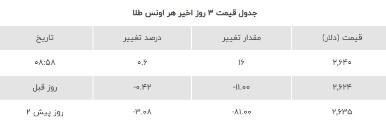 هر اونس طلا امروز با افزایش ۰.۶ درصدی، از ۲,۶۲۴ (دو هزار و ششصد و بیست و چهار ) دلار به ۲,۶۴۰ (دو هزار و ششصد و چهل ) دلار رسید.