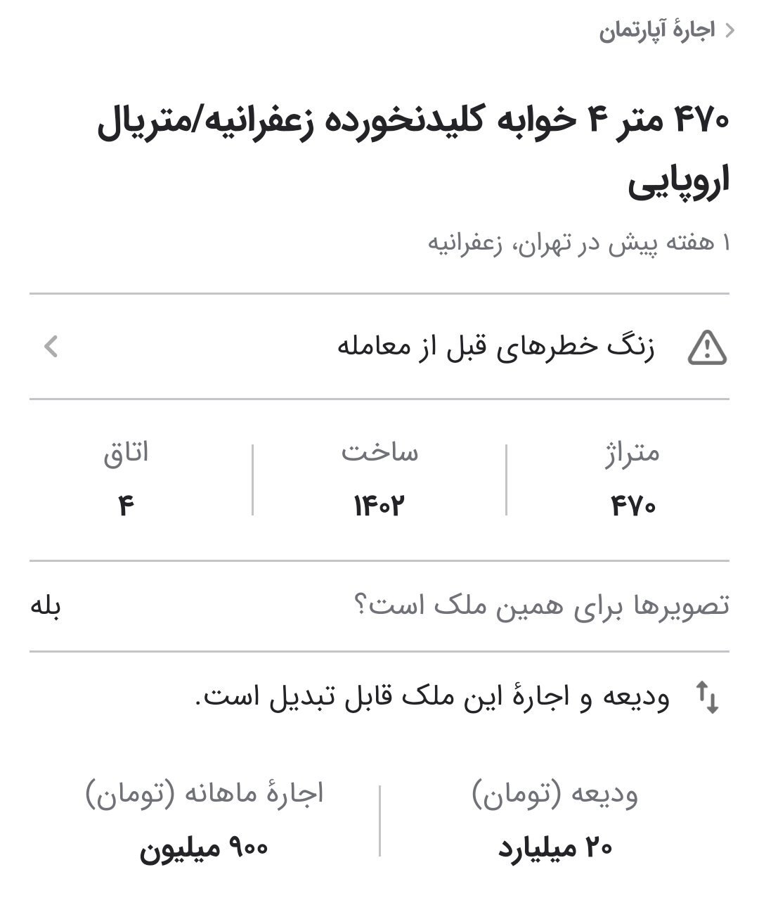 به گزارش پیامدنیوز، در این تصاویر، اجاره برخی از واحد‌ها ۹۰۰ میلیون تومان در ماه اعلام شده، در حالی که ودیعه یکی از این ملک‌ها ۲۰ میلیارد و دیگری ۳ میلیارد تومان است.