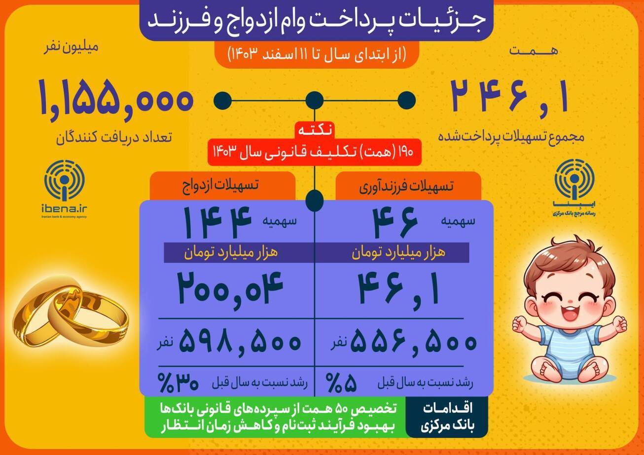 جزئیات پرداخت وام ازدواج و فرزندآوری از ابتدای سال تا روز ۱۱ اسفندماه ۱۴۰۳ اعلام شد.