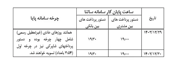 تغییر ساعت کاری سامانه های ساتنا و پایا در دو روز پایانی سال