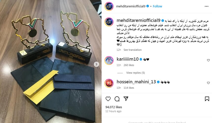 مهدی طارمی، لژیونر ایرانی تیم اینتر که به عنوان مرد سال ورزش ایران انتخاب شده است، با انتشار پیامی در اینستاگرام به آن واکنش نشان داد.