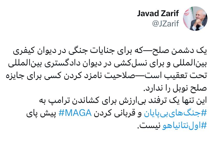 محمدجواد ظریف به کاندیدا کردن رئیس جمهور آمریکا برای جایزه صلح نوبل توسط نخست وزیر اسرائیل واکنش نشان داد.