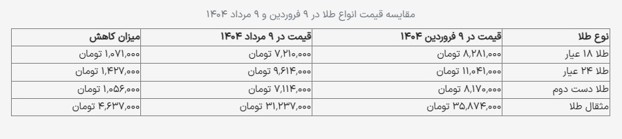 قیمت طلا ۲۴ عیار که در روز ۹ فروردین ۱۴۰۴ با ثبت رقم ۱۱ میلیون و ۰۴۱ هزار تومان رکورد زد نیز در روز پنجشنبه ۹ مرداد ۱۴۰۴ به قیمت ۹ میلیون و ۶۱۴ هزار تومان فروخته شد. در واقع در ۴ ماه اخیر قیمت این نوع طلا یک میلیون و ۴۲۱ هزار تومان کاهش یافته است.