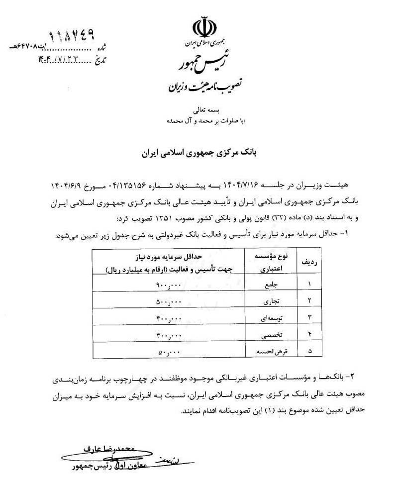 معاون اول رئیس جمهور تصویبنامه هیأت وزیران در خصوص حداقل سرمایه لازم برای تأسیس بانک غیردولتی را ابلاغ کرد.