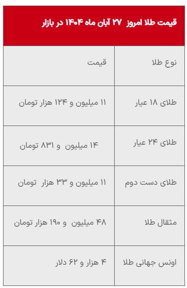 در جدول زیر آخرین قیمت انواع طلا در بازار امروز سه شنبه ۲۷ آبان ماه ۱۴۰۴ را مشاهده میکنید.