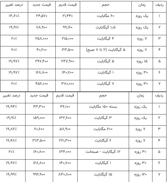 مقایسه قیمتهای قدیم و جدید بستههای اینترنت ایرانسل